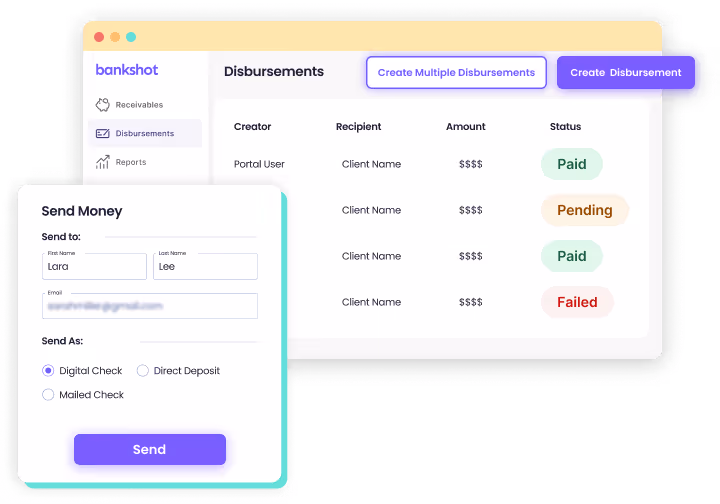 Receive, review, and manage payments securely in Bank Shot’s platform.